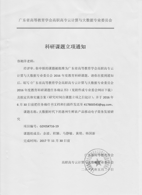 (信息技术系 余波)根据广东省高等教育学会高职高专云计算与大数据专业委员会文件,我院由容湘萍老师领衔的课题《大数据时代下的惠州生鲜农产品移动电子商务发展研究》和由余波老师领衔的课题《云计算下翻转课堂在计算机网络专业教学中的应用研究》获得2016年度广东省高等教育学会高职高专云计算与大数据专业委员会立项,立项编号分别为GDYJSKT16-19和GDYJSKT16-12。