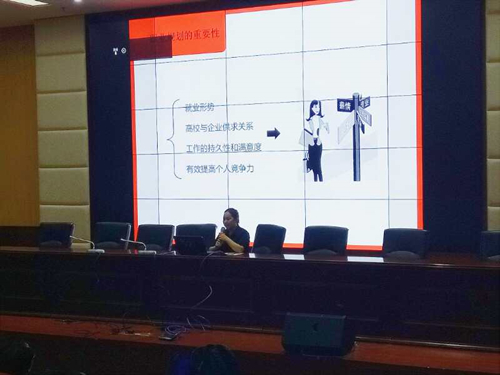 她首先给学生讲解了职业规划的步骤、自我评估方法和途径、职业生涯的目标的制定以及实现,帮助同学们初步了解职业规划的定向。通过职业生涯规划系统的剥洋、SWOT分析、社会用人的价值标准等方面为进一步详细讲述了对于职业规划应该怎么去做,且怎么做到最优。阮女士接着详细讲述了在国家提倡的“一带一路”政策对学生职业规划带来的新机遇、新挑战,她鼓励学生要在“一带一路”的大背景下抓住机遇,迎接挑战,规划好自己的职业生涯,为自己的将来铺好坚实的奠基石,如何让自己成为全方面发展的国际复合型人才、跨文化交际人才将是重中之重。