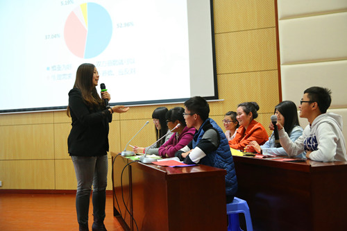 17日下午的课程展示环节,我院向日葵心理协会成员首先带来了心理话剧“守护爱情”,引发了大家关于两性关系中的理解、责任和性行为等问题的思考。结合我院“以学生为中心”师生互动性强的教学特色,胡杨老师带来了关于“谈性说爱”的模拟课堂,课堂以围绕“你是否接受婚前性行为”模拟辩论赛的形式进行,选手们各执己见、妙语连珠,期间在场专家和学生也纷纷参与课堂讨论,论点精彩纷呈。精彩的表演、激烈的讨论让台上台下气氛顿时火热起来,本次心理区域中心年会的展示完美收场。